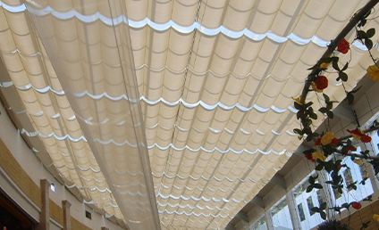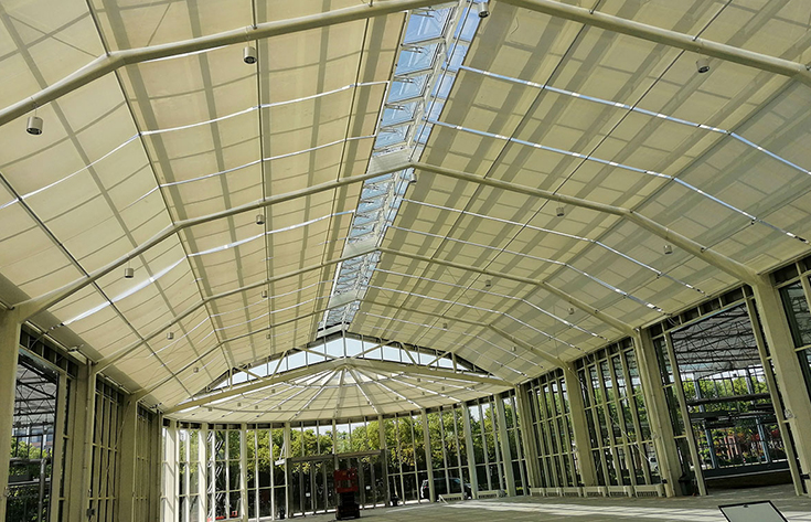大型建筑采光顶一般可以从采光顶外侧设置遮阳和内侧设置遮阳两种方式,简称内遮阳和外遮阳。